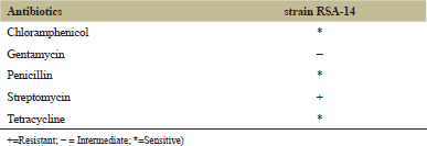 Total of 26 Actinomycetes were isolated and were tested for their ability to grow in the presence of antibiotics, such as Chloramphenicol, Gentamycin, Penicillin, Streptomycin and Tetracycline. The strain RSA-14 was examined for its capacity to grow in the presence of antibiotics and results were recorded (Table 4).