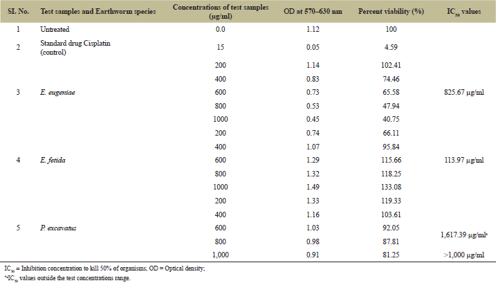 | Table 1: Results of MTT assay with respect to percent viability and IC50 values of untreated, standard drug Cisplatin (Control) and various test concentrations of different epigeic earthworms. [Click here to view] |