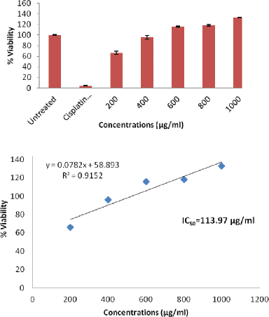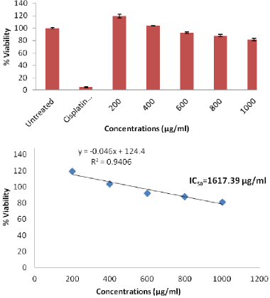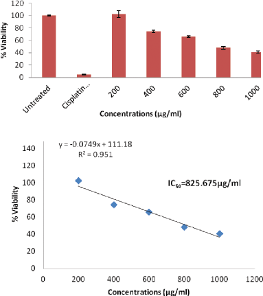 The percent growth inhibition or percent viability of different sample test concentrations and standard chemotherapy drug Cisplatin (15 µg/ml) was calculated. The concentration of test drug needed to inhibit the cell growth by 50% (IC50 value) was generated from the dose response curve for the cell line.