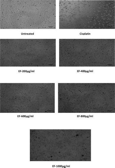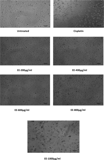 | Plate 1: Images of antitumor activities (% viability of MCF-7 Cells) of untreated, standard drug Cisplatin (15 μg/ml) and various test concentrations (200, 400, 600, 800 and 1,000 μg/ml) of E. eugeniae (EE). [Click here to view] |