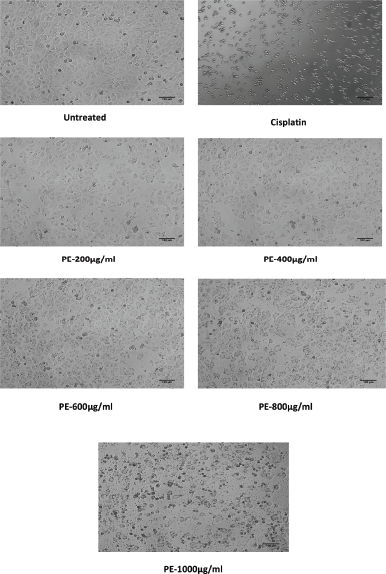 | Plate 3: Images of antitumor activities (% viability of MCF-7 Cells) of untreated, standard drug Cisplatin (15 μg/ml) and various test concentrations (200, 400, 600, 800 and 1,000 μg/ml) of P. excavatus (PE). [Click here to view] |