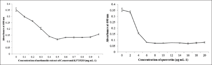 The antibacterial activity of the methanolic extract of C. emersonii KJ725233 against P. aeruginosa MTCC1688 is reported earlier [9]. To determine the MIC of the methanolic extract, broth dilution method was used and the MIC for the methanolic extract of C. emersonii KJ725233 was found to be 0.5 mg mL-1 whereas that of quercetin was 6 μg mL−1 [Figure 1]. However, the MIC of the methanolic extract (0.5 mg mL−1) was found to be bacteriostatic whereas that of quercetin (6 μg mL−1) was found to be bactericidal in nature.