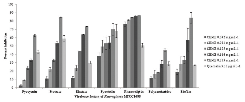 The present study dealt with the spectrophotometric determination of inhibition of P. aeruginosa virulence factors, namely, pyocyanin, protease, elastase, pyochelin, rhamnolipid, polysaccharides, and biofilm production. CEME at 0.33 mg mL−1 exhibited 62.48 ± 1.11% pyocyanin inhibition, 84.72 ± 1.11% protease inhibition, 73.47 ± 0.11% elastase inhibition, 69.95 ± 7.12% pyochelin inhibition, 86.76 ± 0.48% rhamnolipid inhibition, 44.72 ± 1.58% polysaccharide inhibition, and 83.77 ± 6.48% biofilm inhibition. On the other hand, quercetin at 3.33 μg mL−1 exhibited 42.72 ± 2.04% pyocyanin inhibition, 59.05 ± 3.33% protease inhibition, 30.12 ± 1.81% elastase inhibition, 67.88 ± 7.83% pyochelin inhibition, 50.62 ± 2.20% rhamnolipid inhibition, 28.57 ± 2.58% polysaccharide inhibition, and 26.86 ± 0.52% biofilm inhibition [Figure 2].