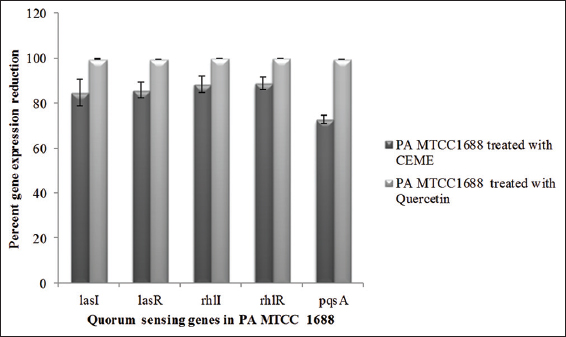 | Figure 3: Percent reduction in expression of quorum sensing genes of Pseudomonas aeruginosa MTCC1688 on treatment with methanolic extract of CEK (0.33 mg mL−1) and with quercetin (3.33 μg mL−1) [Click here to view] |
