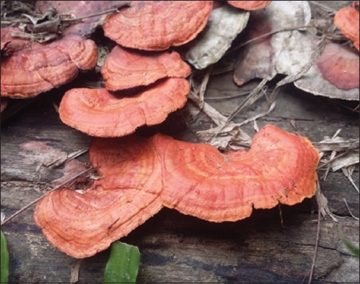 | Figure 1: Wild fruiting bodies of Pycnoporus sanguineus growing on dead hardwood. [Click here to view] |