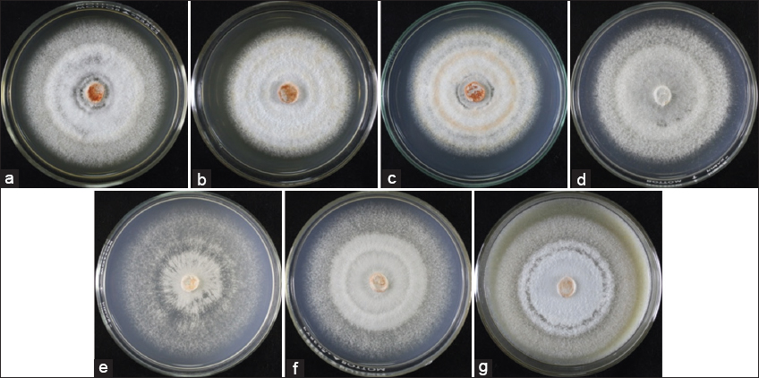 ![]() | Figure 2: Mycelial growth performance of Pycnoporus sanguineus on the different culture media: (a) Malt extract agar (b) potato dextrose agar; (c) Sabouraud dextrose agar; (d) coconut water agar; (e) corn grit broth agar; (f) potato broth sucrose agar and (g) rice bran broth agar after 4 days of incubation. [Click here to view] |