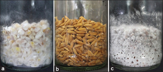 | Figure 3: Mycelial growth of Pycnoporus sanguineus on different spawning materials: (a) cracked corn, (b) rice seeds, and (c) sorghum seeds after 10 days of incubation. [Click here to view] |