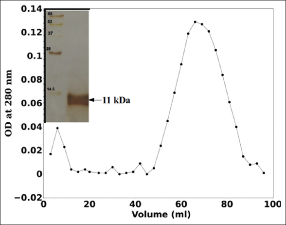 We utilized different isolation buffers with varying pH to extricate the trypsin inhibitor from C. tetragonoloba [Table 1]. The best extraction buffer was phosphate buffer (0.01 M, pH 7.5) as the most elevated trypsin inhibitory action was obtained in the buffer. Hence, phosphate buffer (0.01 M, pH 7.5) was picked as the extraction buffer for the trypsin inhibitor. After ammonium sulfate precipitation followed by dialysis of crushed crude, the protein was loaded on DEAE ion-exchange chromatography column (15.5 × 2.5 cm). The fractions from the DEAE-cellulose segment were pooled, lyophilized, and applied on Sephadex G-75 column (50.5 × 2.5 cm) for further purification [Figure 1]. The trypsin inhibitory action was observed in the solitary elution peak (47 ml-85 ml part of G-75). The active fractions were pooled and analyzed through 14% sodium dodecyl sulfate-polyacrylamide gel electrophoresis [Figure 1]. The protease inhibitor was observed as a single band of an apparent molecular weight of about 11 kDa. Here, it was also observed that after the DEAE purification, the yield of protein is 0.1 mg/ml with 24.13% fold purification showing 100% inhibitory activity.