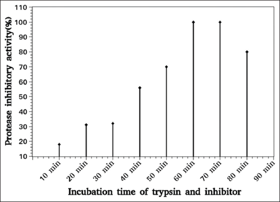 To study the optimum time required by the isolated inhibitor to inhibit the trypsin completely, the enzyme and inhibitor were mixed and incubated for different time intervals from 10 to 80 min. The residual inhibitory activity was analyzed [Figure 3] to determine the optimum time. This result indicates that at 60 min of incubation, trypsin was inhibited completely. On the basis, 60 min incubation was selected for further experiments. Here, we also found that after 70 min of incubation, inhibitory activity decreased. At 80 min and 90 min, it shows 80% and 50% inhibitory activity, respectively.