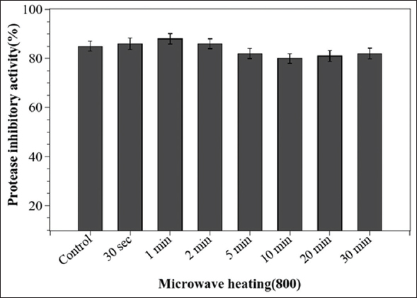 The microwave heating was done for different time periods at power 800watt. The result is shown in Figure 5. It was found that there was no loss of trypsin inhibitory activity even after heating for 30 min with all microwave exposed inhibitors showing above 80% of inhibition similar to that of control, indicating that this inhibitor is highly thermostable.