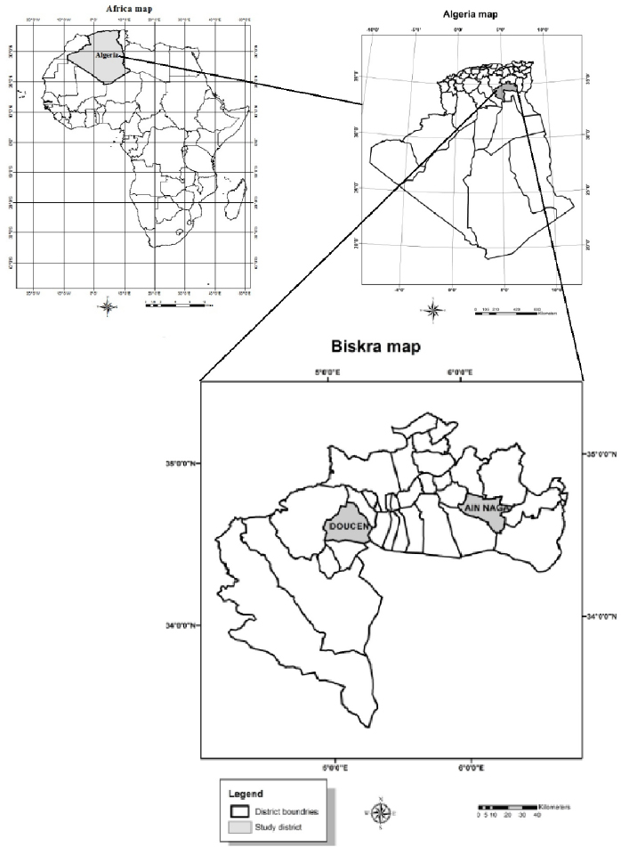 ![]() | Figure 1: Location of the selected study districts: Ain Naga (East Ziban) and Doucen (West Ziban) of Biskra region, Algeria. These maps were produced using ArcMap Version 10.6.1 (ESRI, 2018). [Click here to view] |