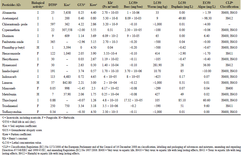 Kh (Henry’s law constant) describes the concentration of pesticide in air (vapor pressure) divided by the concentration in water (solubility) [69]. The higher the Kh, the greater the likelihood that a pesticide volatilizes from moist soil [69]. Therefore, it indicates that the main route of poisoning could be inhalation, especially at high values [68]. Kow is used to describe the transfer of a substance from an aquatic environment to an organism and the bioaccumulation potential of this substance [73–76]. Highly soluble pesticides are more likely to be washed-off from the soil by runoff or to be moved below the root zone through leaching. Besides, the acute toxicity to bee, earthworm, daphnia, and algae was examined for 18 most commonly applied pesticides to characterize the hazard. Acute systemic toxicity evaluates the adverse effects that occur following exposure of organisms to single or multiple doses [77]. Bees are essential pollinators of many plants in natural ecosystems and agricultural crops [78]. Earthworms provide key soil functions that favor many positive ecosystem services [79]. Daphnia is a ubiquitous link in the ecological food chain [80]. Algae are common inhabitants of surface water and are important in soil and associated environments such as irrigation and drainage systems, lakes, and ponds [81]. All these organisms are important for agro-ecosystem sustainability. According to the CLP (Table 2), almost all AIs have potential acute and/or chronic hazardous effects for the ecosystems and environment. The majority of AIs are very toxic to aquatic life, especially with long-lasting effects.