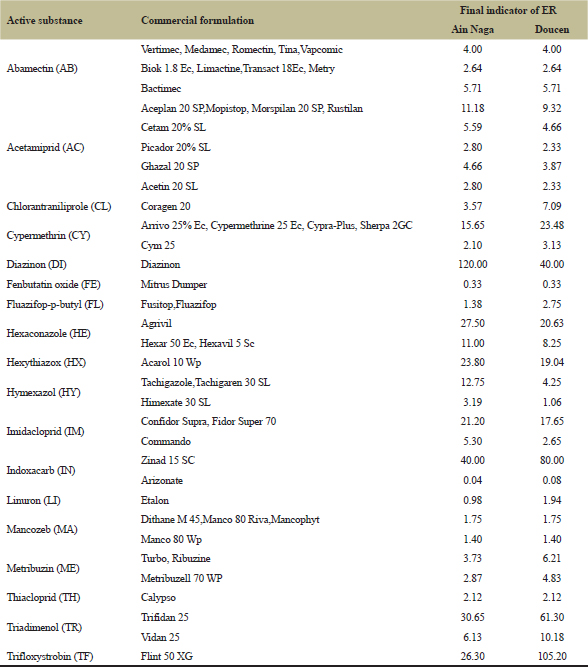 To have a more realistic risk characterization, the final indicator of ER was determined. As shown in Table 4, the final indicator of ER was calculated for each applied chemical product. The values of the final indicator of ER in Ain Naga were ranged from 0.04 to 120.00, whereas, in Doucen, it ranged from 0.08 to 105.20. The higher values can be the result of the disrespect of doses recommended in the labels and/or because of the toxicity and the physicochemical properties of the active substances. Besides, as shown in Table 4, the same active ingredient can be found in many commercial formulations, with different standard application rates (Phytosanitary index 2015).