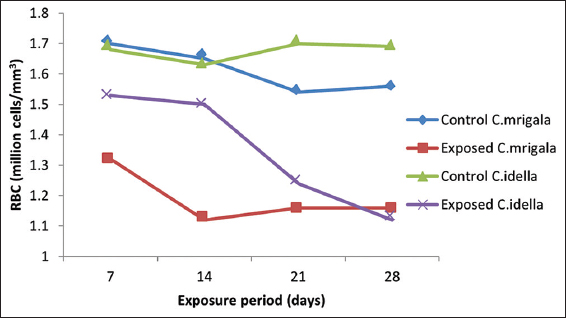 The minimum RBC counts of the control groups of C. mrigala and C. idella recorded values 1.54 ± 14.32 million cells/mm3 and 1.63 ± 17.43 million cells/mm3, respectively, and those of the treatment groups 1.12 ± 24.3 million cells/mm3 and 1.12 ± 43.24 million cells/mm3, respectively. While there was no significant (P > 0.05) decrease in RBC values at any exposure period in C. mrigala, the decrease was significant (P < 0.05) on the 28th day of exposure in C. idella [Figure 1].