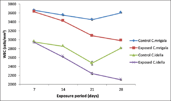 The minimum WBC counts of the control and treatment groups of C. mrigala and C. idella recorded values 3450 ± 20.2 cells/mm3, 2475 ± 43.3 cells/mm3, and 2980 ± 8.66 cells/mm3, 2100 ± 14.43 cells/mm3, respectively. The decrease in WBC values was significant (P < 0.05) from the 14th day of exposure in C. mrigala, whereas, except on 7th day, there was a significant (P < 0.05) decrease in WBC in C. idella [Figure 2] compared to the control group. Similar observations were seen in Prochilodus lineatus by Martinez et al. The reduction in WBC count of both C. mrigala and C. idella might be due to a compensatory reaction, i.e., secretion of high level of cortisol as part of non-specific stress changes, leading to low WBC count. The primary stress responses, i.e., release of adrenalin and cortisol, trigger biochemical and physiological alterations called secondary stress responses [7]. Jezierska and Witeska observed an increase in cortisol concentration of plasma in fish exposed to copper and lead [16].