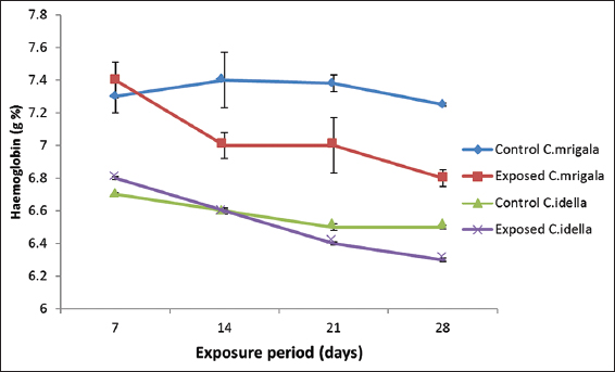 | Figure 3: Sublethal effect of lead on the hemoglobin content of control and treatment groups of Cirrhinus mrigala and Ctenopharyngodon idella [Click here to view] |