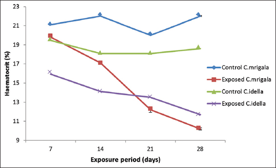 The hematocrit of the control groups of C. mrigala and C. idella recorded least values of 20.0 ± 0.05% and 18.10 ± 0.01%, and those of the treatment groups recorded 10.2 ± 0.17% and 11.70 ± 0.11%, respectively. In the present study, hematocrit of the lead treatment groups of both C. mrigala and C. idella decreased significantly (P < 0.05) relative to that of the control [Figure 3]. Shah reported low hematocrit in T. tinca exposed to long-term sublethal levels of lead [8]. A similar response was reported by Martinez et al. in P. lineatus exposed to sublethal concentration of lead [7]. On the contrary, Adeyemo et al. reported that hematocrit levels of A. anguilla increased after exposure to lower sublethal concentration (0.06 ppm Pb) in 15 and 30 days, whereas, higher sublethal concentration (0.12 ppm Pb) did not alter the hematocrit levels [17]. While the response to the lower sublethal concentration has been explained by release of RBC by erythropoietic tissues, response to higher sublethal concentration has been attributed to hormonal mechanisms.