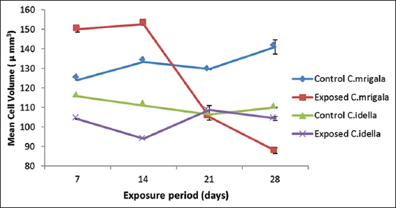 | Figure 5: Sublethal effect of lead on the mean cell volume of control and treatment groups of Cirrhinus mrigala and Ctenopharyngodon idella [Click here to view] |