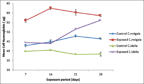 The minimum recorded mean cell hemoglobin (MCH) of the control groups of C. mrigala and C. idella was 42.93 ± 0.63 pg and 38.23 ± 0.03 pg, respectively, and those of the treatment groups were 56.05 ± 0.86 pg and 44.0 ± 0.14 pg, respectively. While, MCH concentration (MCHC) of the control groups of C. mrigala and C. idella recorded values 32.95 ± 0.95% and 34.44 ± 0.01%, respectively, those of the treatment groups recorded 37.37 ± 0.2% and 42.65 ± 0.05%, respectively. There was a significant (P < 0.05) increase in MCH and MCHC at all exposure periods in both the species, relative to control group [Figures 6 and 7]. Similar response has been reported by Adeyemo, in C. gariepinus exposed to sublethal concentrations of lead, and in Tench (T. tinca) on short-term exposure to lead [8,14]. The alterations in the latter study, were attributed to hemolysis and impairment in hemoglobin synthesis, stress-related release of RBCs from the spleen and hypoxia, in response to damage of RBC membranes, induced by exposure to lead. This has been explained by RBC shrinkage due to hypoxia or microcytic anemia, because of decrease in hematocrit during exposure. Structural changes in RBCs may result in an elevation in blood parameters [23].