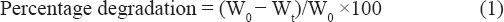 Percentage degradation = (W0 − Wt)/W0 ×100 (1)