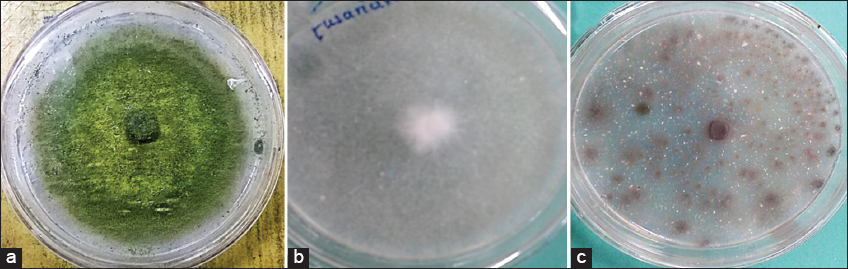 | Figure 1: Pure culture of fungal isolates (a) A. flavus, (b) Fusarium sp., (c) A. fumigatus [Click here to view] |