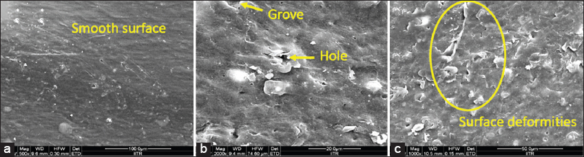 ![]() | Figure 2: SEM analysis of HDPE surface deformities (a) Control, (b) treated HDPE, and (c) non-treated polyethylene [Click here to view] |