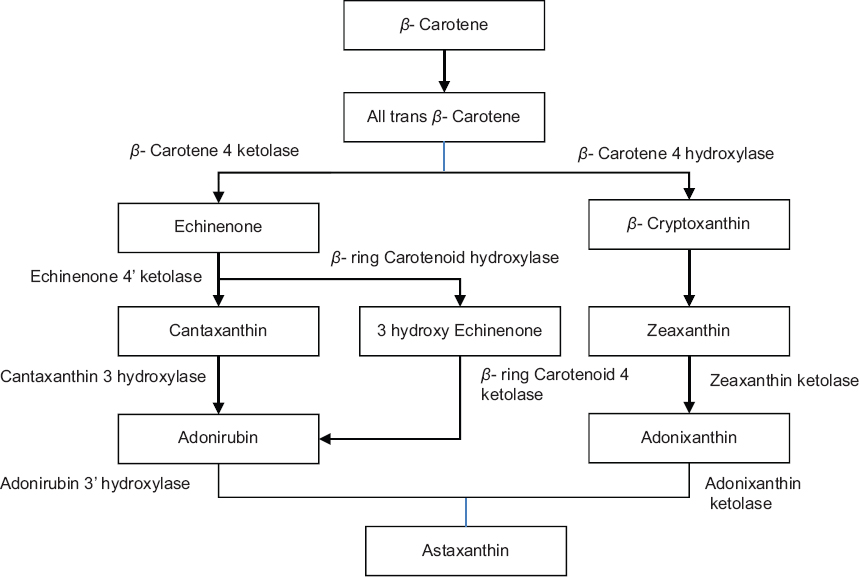 ASX has a similar metabolic and physiological function as other carotenoids bear, such as Vitamin C, a-tocopherol, canthaxanthin, zeaxanthin, lutein, and b-carotene; however, ASX is considered as more bioactive compared to others. This is mainly due to the occurrence of hydroxyl and a keto group on each end of the molecule. However, unlike others, it does not convert into Vitamin A. The biosynthetic pathway of ASX was demonstrated in Figure 2.