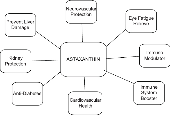 In a polyene chain, the carotenoids possess long covalently-linked double bonds which are accountable for antioxidant properties. This property scavenges radicals for inhibition of chain reaction and quenching oxygen in a singlet. Compared to other antioxidants, ASX displays greater biological activity since it can bind from inside to outside within the cell membrane. ASX’s polyene chain appears to trap radicals inside the membrane of a cell, whereas the terminal ring of ASX can eliminate radicals both at the interior and in the cell membrane surface. Recently, ASX has drawn much attention from researchers because of its greater antioxidant properties as compared to other naturally occurring carotenoids.