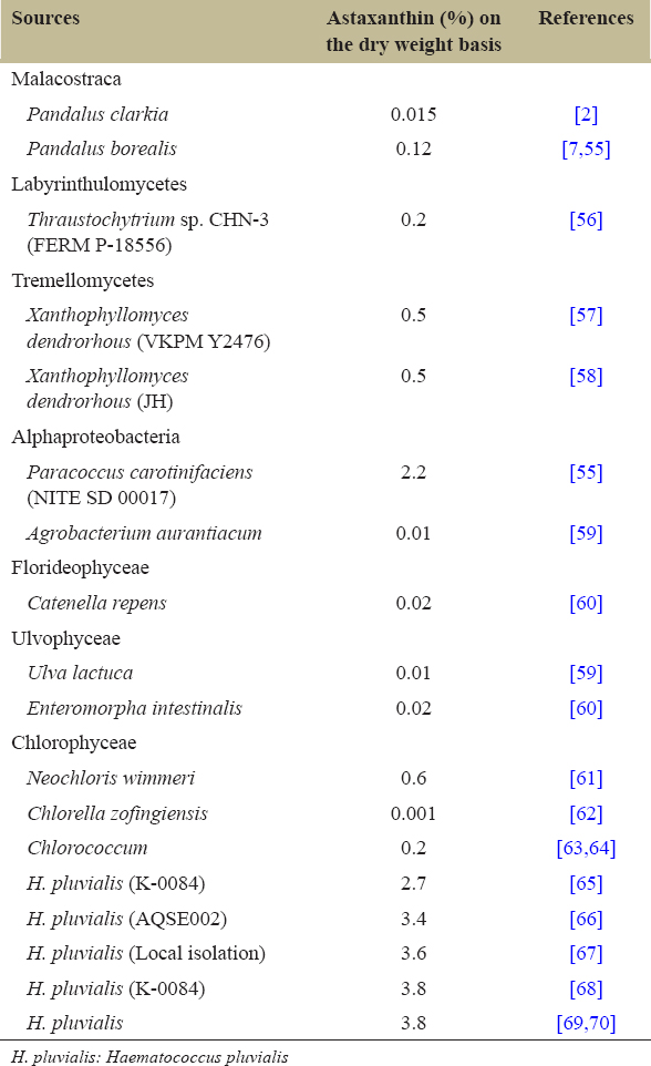 SourcesAstaxanthin (%) on the dry weight basisReferences