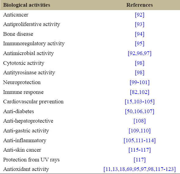 In marine animals, ASX possesses many important biological functions, including defense against macromolecular oxidation, stress tolerance, immune response, reproductive ability, ultraviolet (UV) light effects, communication, and pigmentation [3]. Due to its specific molecular structure, compared to the other carotenoids, the ASX possess higher antioxidant property [4] such as having both hydroxyl and a keto group, play an important role in neutralizing reactive oxygen species (ROS). ASX protects cell membranes’ integrity by inserting themselves into their bilayers, mitochondria functional integrity, and redox state preservation [5]. Due to its “super-anti-oxidant” property, ASX provides various health benefits and nutraceutical applications to humans, including antidiabetic, kidney protection, atherosclerotic cardiovascular disease (CVD), prevention of liver damage, immunomodulator, neurodegenerative diseases, and many others [Figure 3].