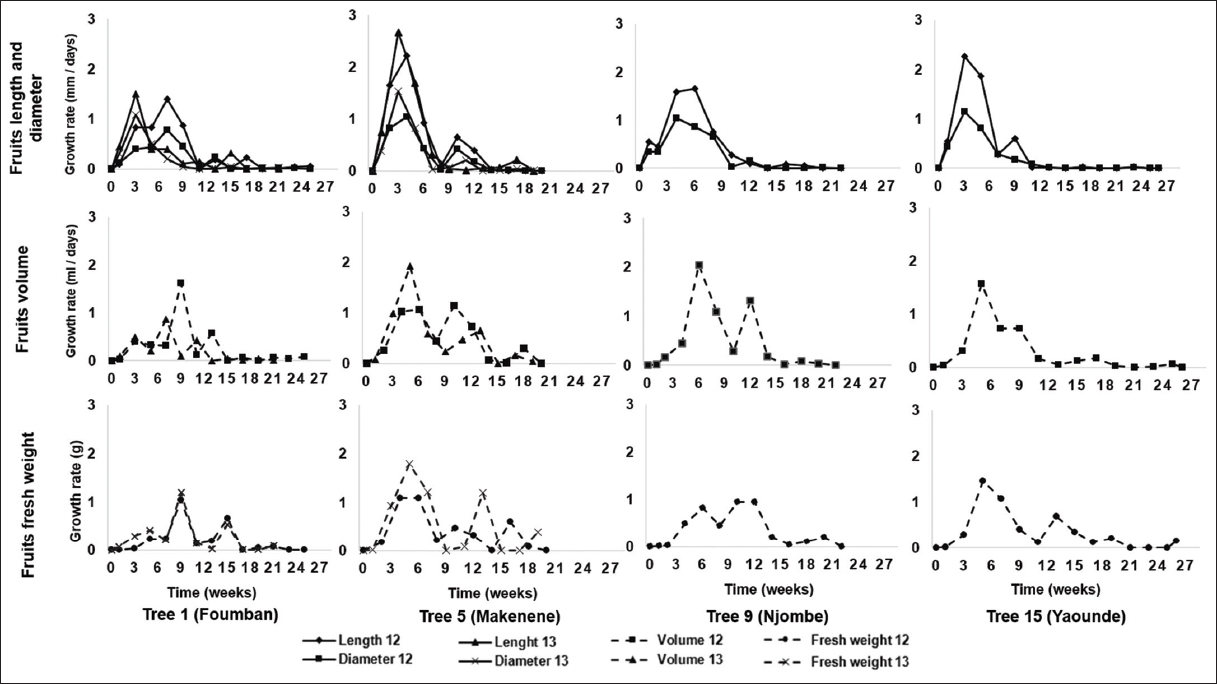 | Figure 4: Growth rate of measured parameters in Dacryodes edulis fruits collected at Foumban (AEZ III), Makenene (AEZ: V), Njombe (AEZ IV), and Yaounde (AEZ V) in 2012 and 2013 [Click here to view] |