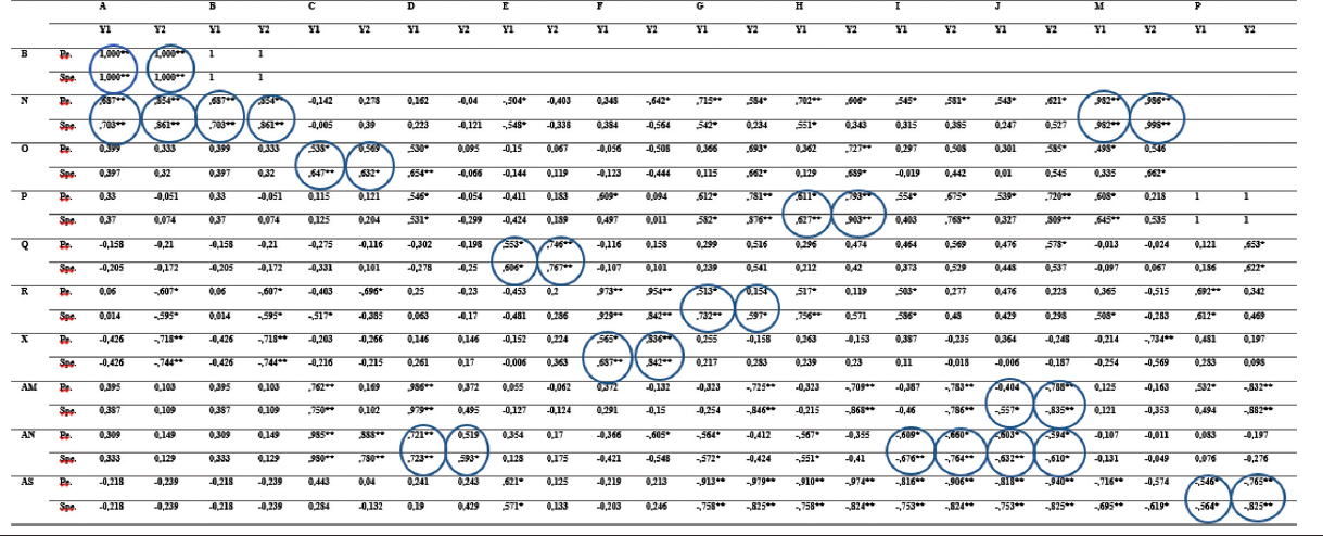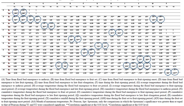 The Pearson and Spearman correlation coefficients revealed a negative correlation between (AM) the time during the fruit set to end of ripening period and (J) average temperature during the floral bud emergence to end of ripening period (P < 0.05 in Y1 and P < 0.01 in Y2); between AN and (I) the average temperature during the floral bud emergence to ripening onset period (P < 0.01 in Y1 and Y2) and J (P < 0.01 in Y1 and P < 0.05 in Y2).