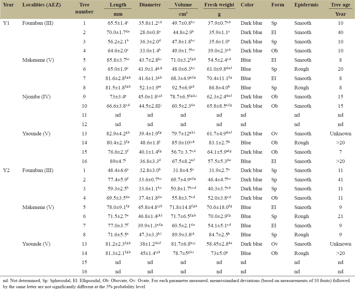 | Figure 3: Morphological characteristics of Dacryodes edulis fruits collected at Foumban (AEZ III), Makenene (AEZ: V), Njombe (AEZ IV), and Yaounde (AEZ V) in 2012 and 2013 [Click here to view] |