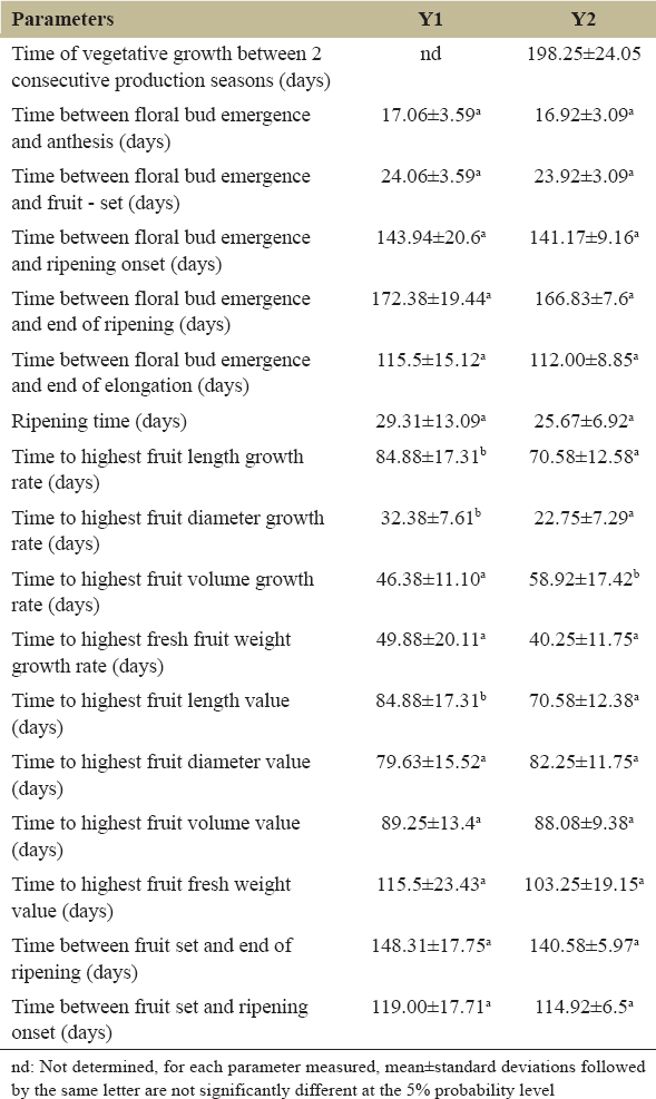 | Time of vegetative growth between 2 consecutive production seasons (days) | nd | 198.25±24.05 |