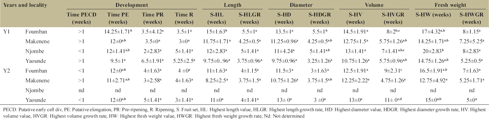 The fruit set-to-ripening period [Figure 2] ranged from 19 to 25 weeks in Y1 and was 21 weeks in Y2 on the same trees at Foumban. That time ranged from 18 to 21 weeks in Y1 and from 19 to 21 weeks in Y2 at Makenene. However, the African plum trees needed 18–22 weeks in Y1 at Njombe, while at Yaounde, the trees needed 19–26 weeks in Y1 and 19–23 weeks in Y2 between fruit set and ripening. Nevertheless, the average time between fruit set and ripening in Y1 (21.36 ± 2.56 weeks) was not significantly different (P ≥ 0.05) to that in Y2 (20.3 ± 1.11 weeks).