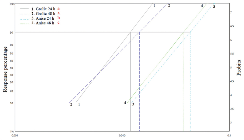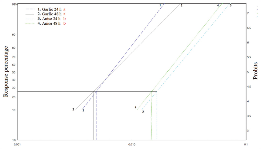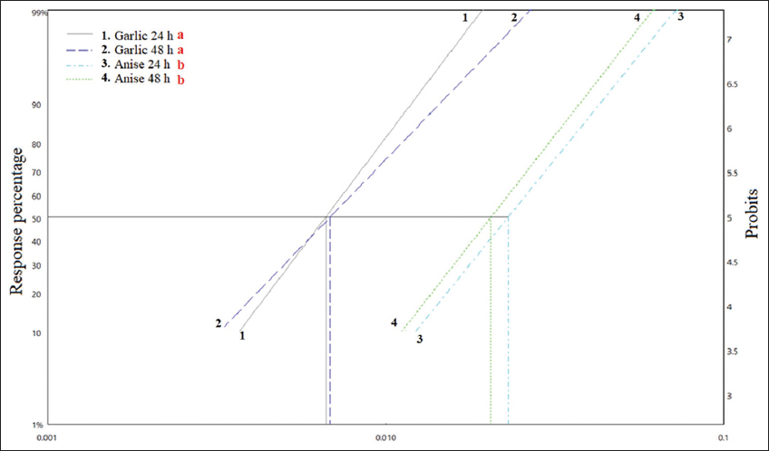 | Figure 2: Relative toxicity based on LC50 values of pure garlic and anise essential oils on Ae. aegypti larvae after 24- and 48-h exposure. The different red letters that appear at the end of description words indicate statistically significant differences between groups (P < 0.05) (in the top left corner) [Click here to view] |