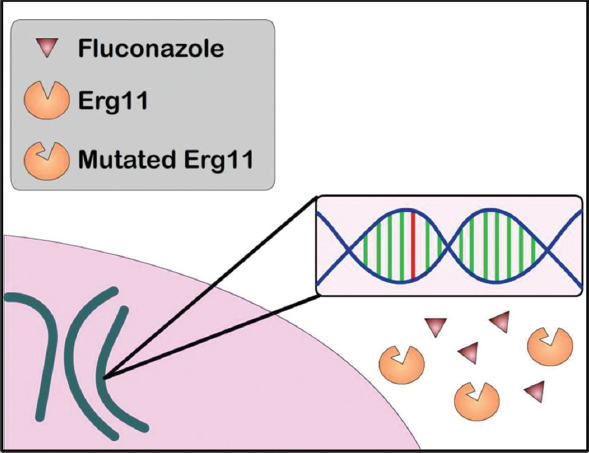 | Figure 3: Mutation in ERG11 leads to expression of proteins with reduced affinity for fluconazole binding. Source: Adapted from Whaley et al., 2017 [90]. [Click here to view] |