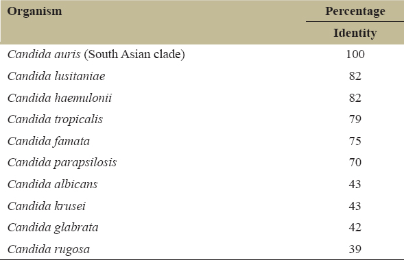 Table 1: Percentage identity of C. auris with other Candida species using D1-D2 region of rDNA (Source: Jeffery-Smith et al. 2017 [18]).