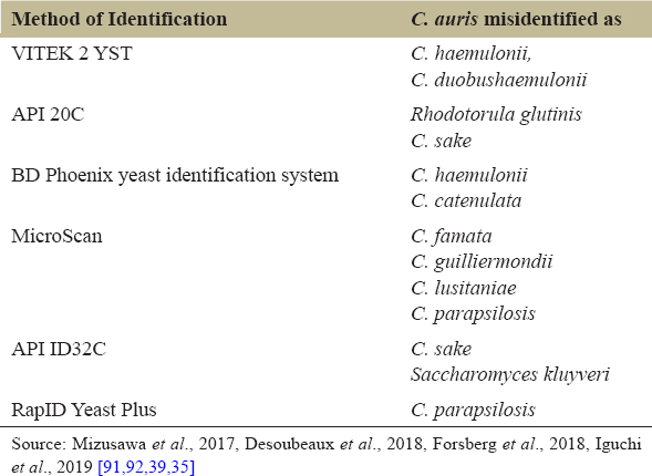 Table 2: Misidentification of C. auris by commercial identification methods.