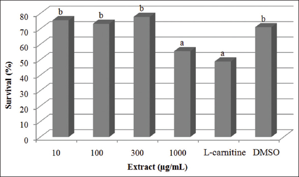Nematode acute lethality assay was performed first to confirm the safety of the extract. The nematodes treated with 1000 μg/mL recorded the lowest percentage survival [Figure 1]. This effect was found statistically comparable to the effect of the control L-carnitine. However, those exposed at 300 μg/mL and lower concentrations showed higher percentage survival and were found comparable to the DMSO-treated nematodes. Furthermore, none of the extract concentrations used showed a below 50% survival rate. Hence, the mycelial extract of L. strigosus would be considered safe for further assays.