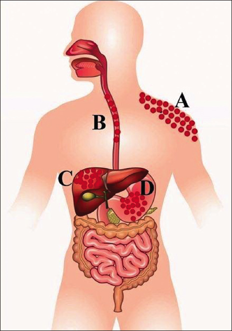 ![]() | Figure 2: Effects of hexavalent chromium [Cr(VI)] on human body: A – skin, B – esophagus, C – liver, D – stomach. [Click here to view] |