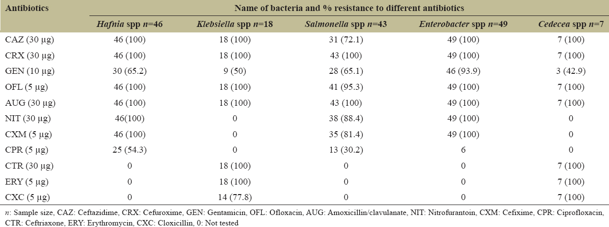 The species isolated showed varying susceptibility patterns to the selected antibiotics. Hafnia species were resistant to ceftazidime, cefuroxime, ofloxacin, amoxicillin/clavulanate, nitrofurantoin, and cefixime with 65.2% (30) and 54.3% (25) of the organisms resistant to gentamicin and ciprofloxacin, respectively [Table 1]. Klebsiella species were not different in resistance pattern as they were resistant to ceftazidime, cefuroxime, ceftriaxone, erythromycin, ofloxacin, and amoxicillin/clavulanate with half of the species resistant to gentamicin [Table 1]. The trend in resistance pattern of Enterobacter and Cedecea species was similar to other species described above. Enterobacter species isolated were resistant to ceftazidime, cefuroxime, ofloxacin, amoxicillin/clavulanate, nitrofurantoin, and cefixime. Likewise, Cedecea species were resistant to ceftazidime, cefuroxime, ceftriaxone, erythromycin, cloxicillin, ofloxacin, and amoxicillin/clavulanate. More than 50% of Salmonella species were resistant to seven antibiotics tested [Appendix 1-5].