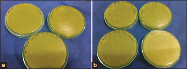 ![]() | Figure-1: Metal-resistant bacterial plates (a = Chromium and Nickel plate with 1500 mg/l and 1000 mg/l Cr (VI) and Ni (II) concentration, b = Chromium and Nickel plate with 500 mg/l and 800 mg/l Cr(VI) and Ni(II) concentration). [Click here to view] |