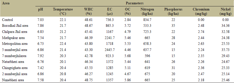 The Kolkata Municipal Corporation area generates more than 2500 metric tons of garbage daily, making the soil much more polluted every passing year. This ecosystem having different structural components (water, soil, macrophytes, and plants) acts as ecological features in east Kolkata wetland area. The comparative results obtained from different collected samples show that the temperature is slightly higher in metropolitan khal area, pH and organic carbon content of soil is high in 7 numberjhil area and nunebheriarea. Water holding capacity, Phosphorus, Nitrogen content, and Electrical Conductivity are also higher in nunebheri area, borodhaljhil, chilparajhil, and five numberjhil. Chromium content is higher in chilparajhil area and also Nickel content is high in five numberjhil. pH of the samples collected is in neutral condition, between 7 and 8. On the other hand, nitrogen was found to be similar for each area and the range is between 500 and 800kg/ha. The range of chromium present in all the collected sample is between 2 and 3 mg/kg, whereas nickel content is high in five numberjhil, borodhaljhil, and chilparajhil area, the range is 30–35 mg/kg [Table 1].