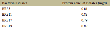 ![]() | Table 3: Protein concentration of different bacterial isolates using BSA standard curve. [Click here to view] |
