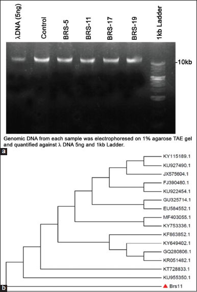 ![]() | Figure 2: Identification of bacterial strain (a) genomic DNA of different bacterial isolates on 1% agarose TAE gel. (b) Phylogenetic tree of the bacterial isolate by 16SrRNA sequencing. [Click here to view] |