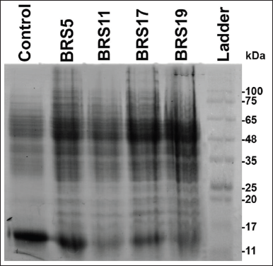 Genomic DNA was also extracted from the overnight grown culture of four stressed bacterial sample BRS 5, BRS 11, BRS 17, BRS 19, and one unstressed bacteria B. cereus (MTCC-430). The samples were electrophoresed on 1% agarose gel against 1kb DNA ladder [Figure 2a]. Bacterial samples when exposed to stress condition showed some pigment releasing activity where the color of broth culture changed from yellow to green. Before the molecular weight determination using SDS-PAGE protein concentration of the isolates were checked as per BSA standard curve. As per the result, protein concentration of all the samples increased after the color change [Table 3]. Overnight grown culture of four stressed bacterial sample and one control unstressed sample B. cereus (MTCC-430) electrophoresed using SDS-PAGE electrophoresis for estimation of protein. The protein is separated on the basis of it is molecular weight using protein ladder [Figure 3]. From the biochemical observation, the bacterial isolate was identified as Bacillus sp. Further the result of 16srRNA sequencing was performed which confirms it as B. cereus and the phylogenetic tree is given Figure 2b.