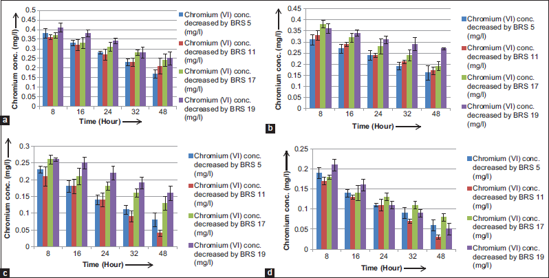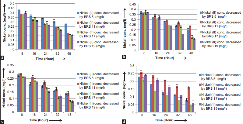 Here, in twenty isolated colonies the concentration of nickel is higher than that of chromium [Figure 4]. Influence of different Electron donor (glucose, glycine, Na-acetate, and peptone) on chromium (VI) concentration (20 mg/l) by different time intervals of BRS 5, BRS 11, BRS 17, and BRS 19 bacterial strains [Figure 5a-d]. Influence of different electron donor (glucose, glycine, Na-acetate, and peptone) on nickel (II) concentration (20 mg/l) by different time intervals of BRS 5, BRS 11, BRS 17, and BRS 19 bacterial strains [Figure 6a-d].