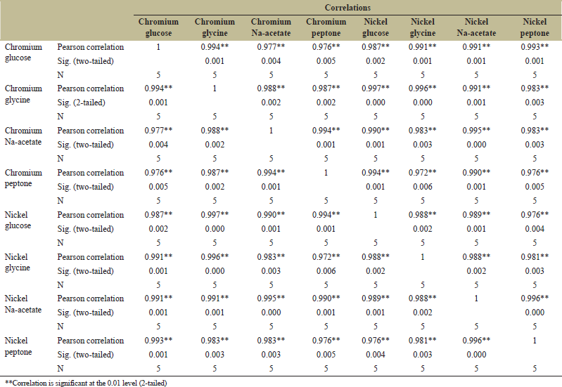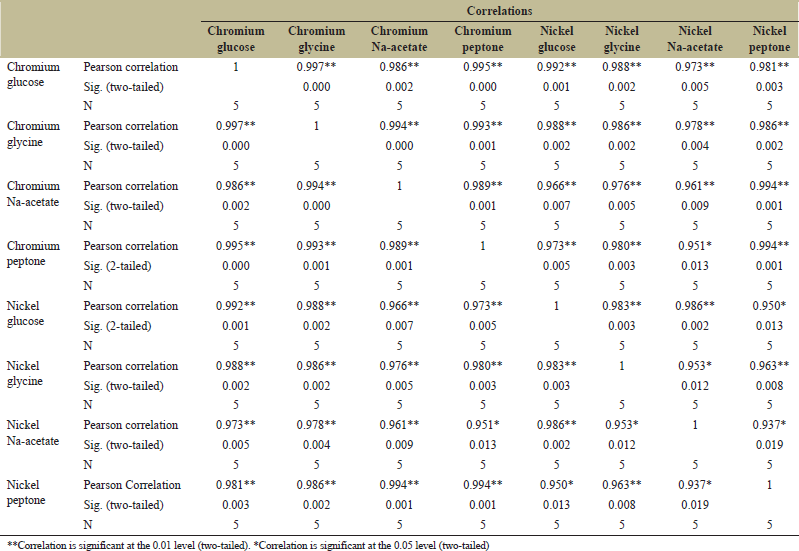 Triplicate measurements were done in all the cases during the observation and assessment of bacterial growth incorporated with different levels of heavy metals. Data were captured into Microsoft Excel Software, version 2010 which was used to calculate means, standard deviations and standard errors [16]. Pearson’s correlation was also performed for the heavy metal accumulation and reductions using IBM SPSS statistics 22 software.