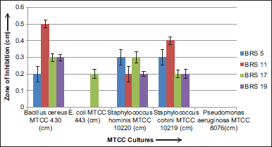 The antimicrobial activity of isolated BRS 5, BRS 11, BRS 17, and BRS 19 was determined by the disk diffusion method against five different bacterial strains. A standard amoxicillin antibiotic was used in this study as control. None of the samples showed activity against P. aeruginosa MTCC 8076, whereas only BRS 17 showed activity against E. coli MTCC 10220 which indicates it as a potent antimicrobial organism. All four samples showed antimicrobial activity against B. cereus, S. cohnii, and S. hominis [Figure 7].
